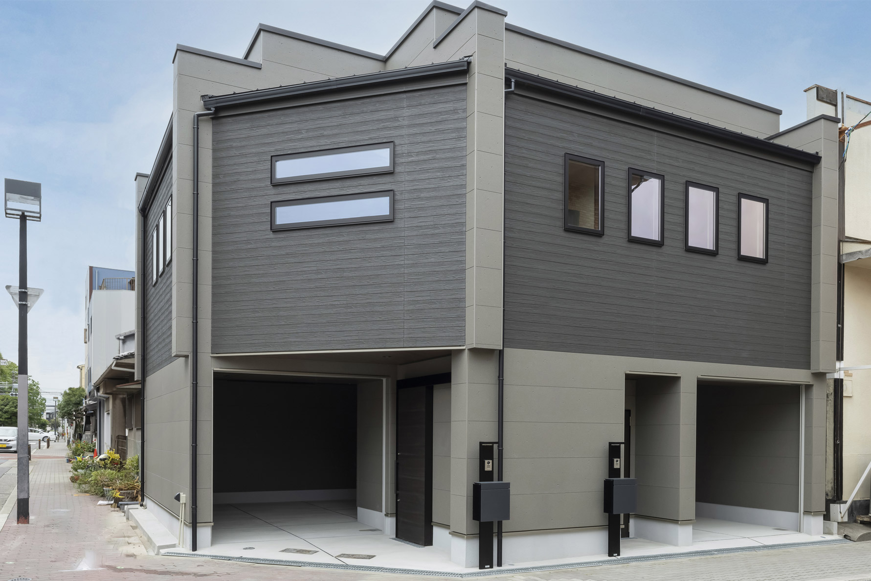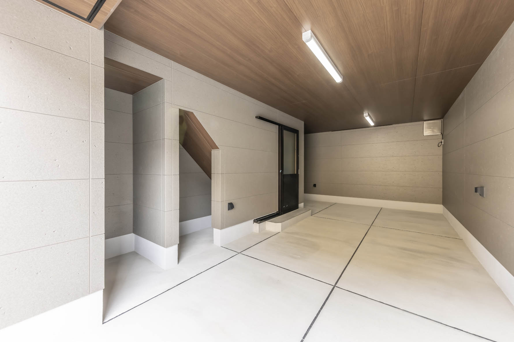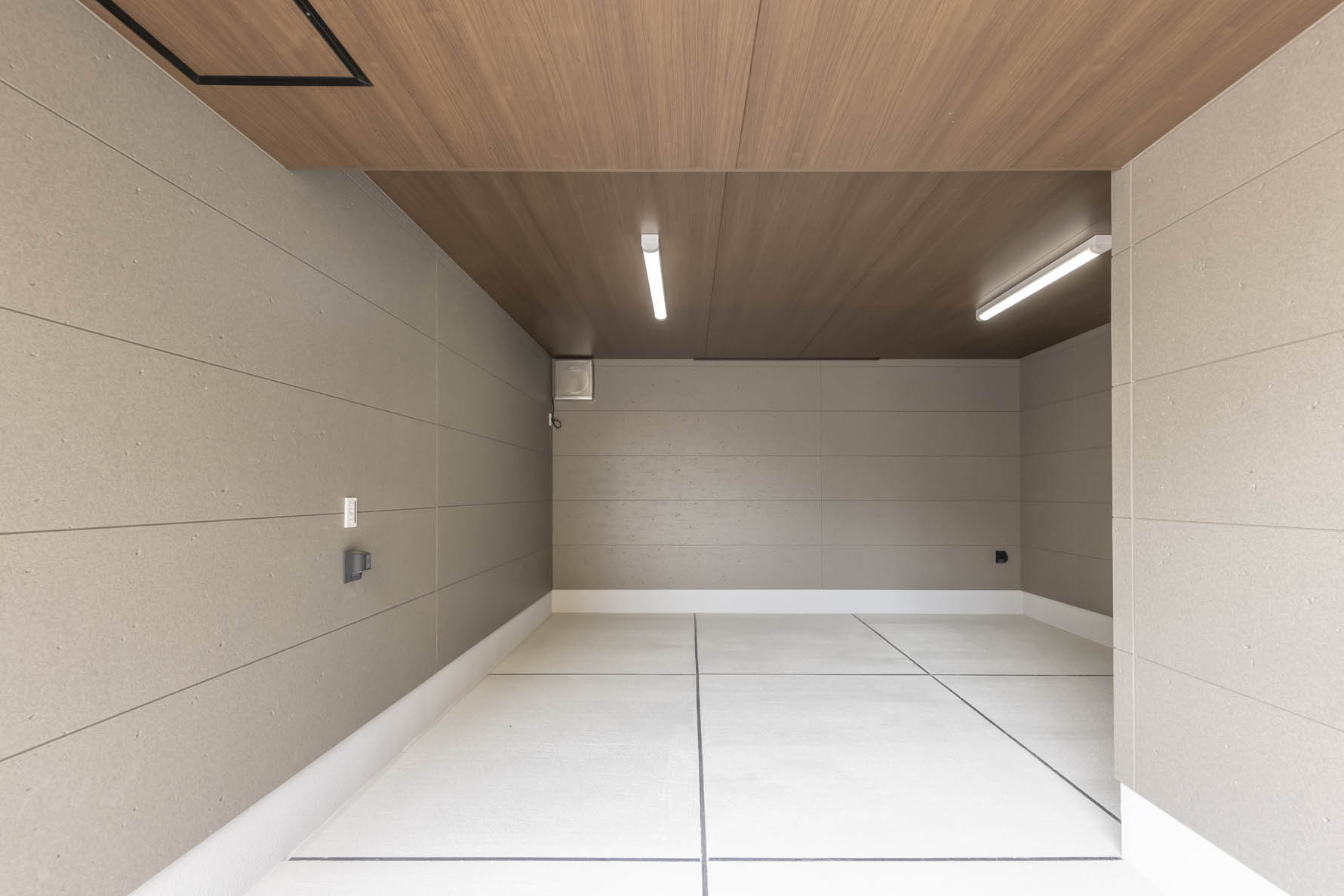 雨の日も安心の広々ビルトインガレージ付き木造建物。